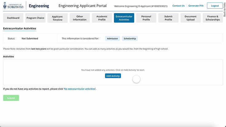 All sections of the admission application have to be submitted, some sections such as extracurricular activities can be submitted even without data. The current interface does not clearly explain such scenarios to the applicant.